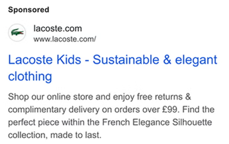 Next up is a paid-for Google search ad for Lacoste which stated, “Lacoste Kids – Sustainable … clothing.” The ASA asked whether the unqualified “sustainable clothing” claim was misleading. In its response, Lacoste cited a multi-year environmental strategy, high use of certified fabrics in the Kids range, and life cycle analyses indicating a reduction in environmental footprint for the 2025 season Kids collection versus the 2022 season. The ASA nevertheless found that “sustainable” was an absolute claim likely to be read as asserting no environmental harm across the life cycle. The comparison to prior seasons did not substantiate that absolute proposition, and the ad itself did not explain the basis of the term. It's therefore no surprise that the claim was found to breach the rules on misleadingness, substantiation and environmental claims. The ASA welcomed removal of the ad but instructed Lacoste to clarify the basis of any future environmental claims and hold high-level substantiation.